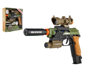 Pistole s doplňky plast na baterie se zvukem se světlem v krabici 25x23x5cm