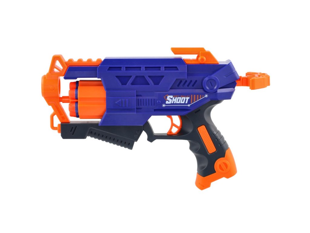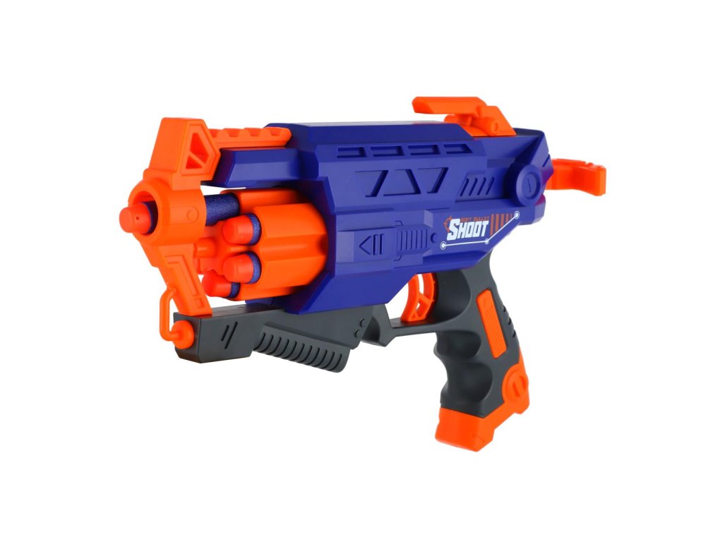 Připrav se na zábavnou střelbu! Tato plastová pistole na pěnové náboje má moderní design a snadné ovládání, takže je ideální pro napínavé souboje doma i venku. Skvělá volba pro malé akční hrdiny!Délka pistole: 28 cm