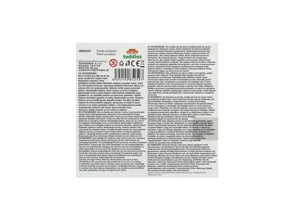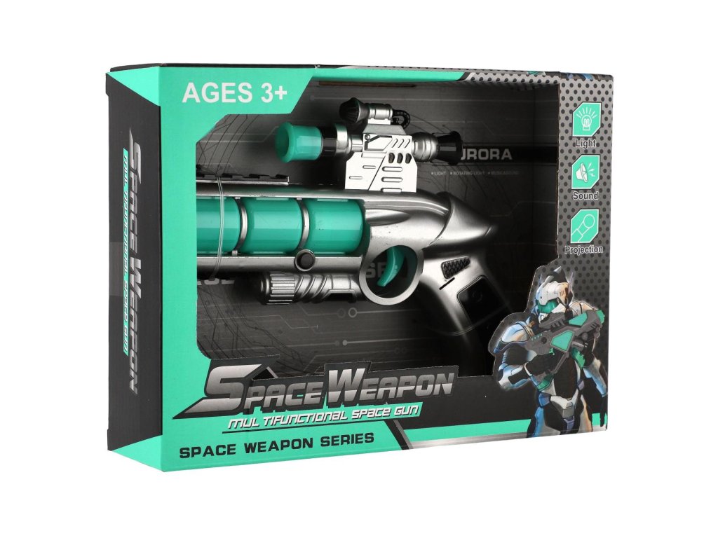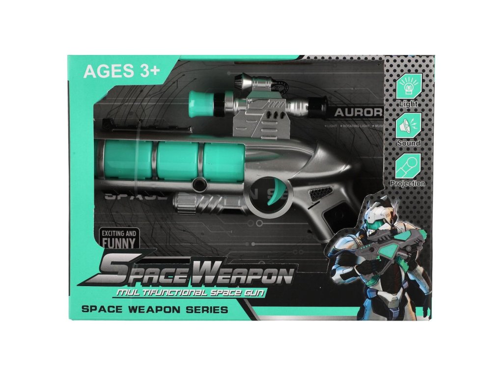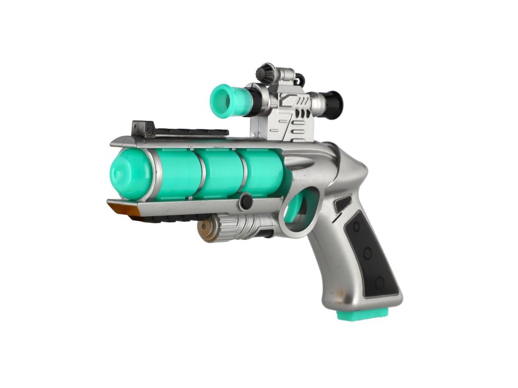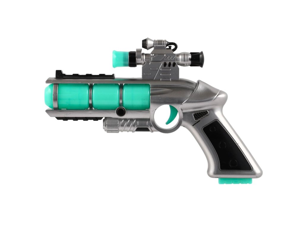 Pistole se zaměřovačem je reálně vypadající zbraň z plastu pro děti, bude se zajisté líbit všem klukům, kteří mají rádi zbraně. Po vložení baterií 2x AA vydává zvuky a svítí.Rozměry balení 23 x 17 x 6 cm.
