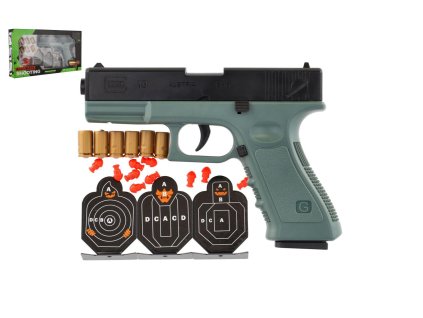 Pistole na pěnové náboje plast 19cm + terče 3ks, náboje 6ks v krabici 34x18x4,5cm