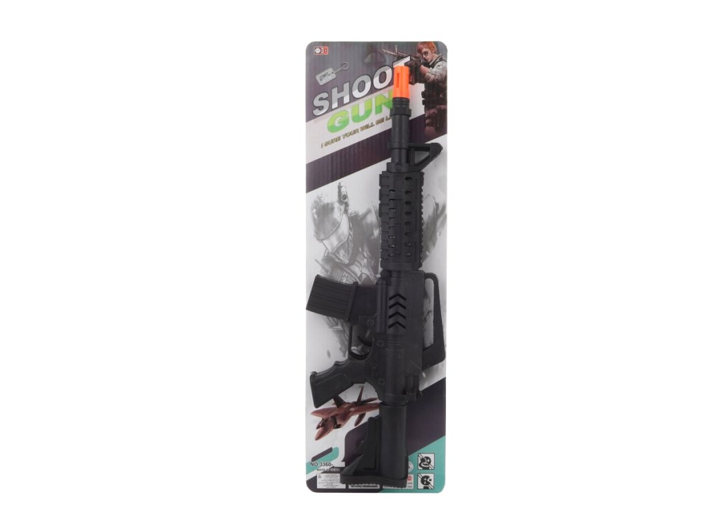 Plastový samopal o rozměru cca 40 x 13 cm. Po stisknutí spuště vydává zvuk střílení (není potřeba baterie). Rozměry balení cca 44 x 14 x 4 cm. Věk 3+