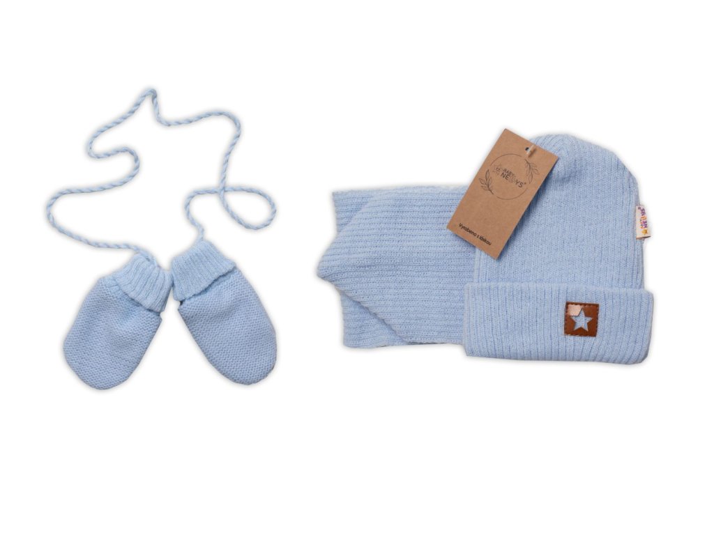 Baby Nellys Pletená čepice s šálou a rukavičky 3v1, STAR - sv. modrá