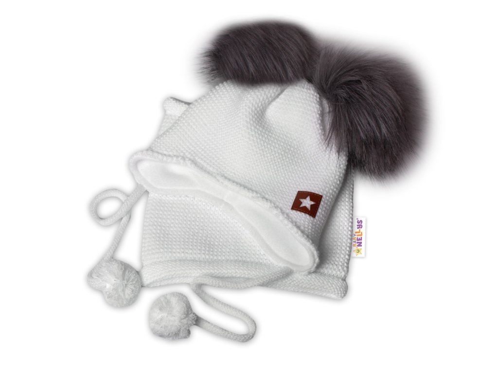 BABY NELLYS Zimní čepice s fleecem a chlupáčkové bambulky Star + komínek - bílá