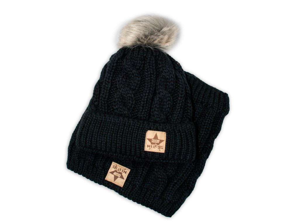 BABY NELLYS Zimní pletená čepice s bambulí + komínek, černá