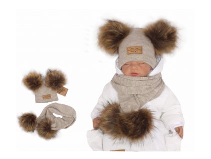 Z&Z Zimní čepice s bambulemi z kožešinky a šálou 2v1, béžová