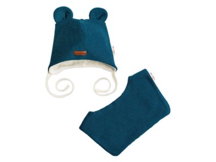 Pletená čepice s bavlněnou podšívkou a šátkem 2v1, Teddy Hand made - petrolejová
