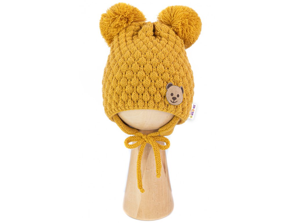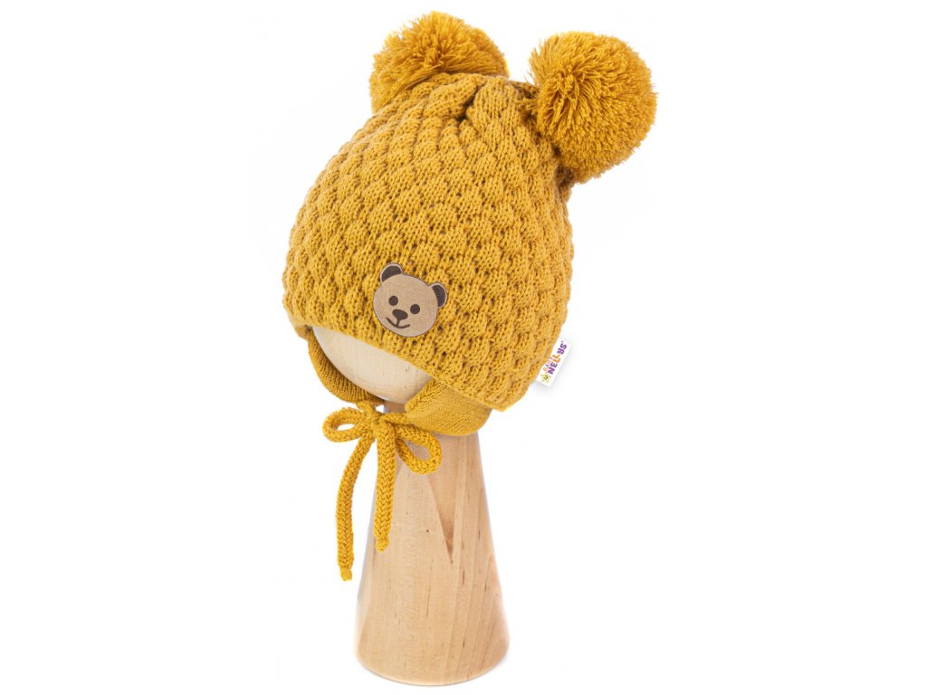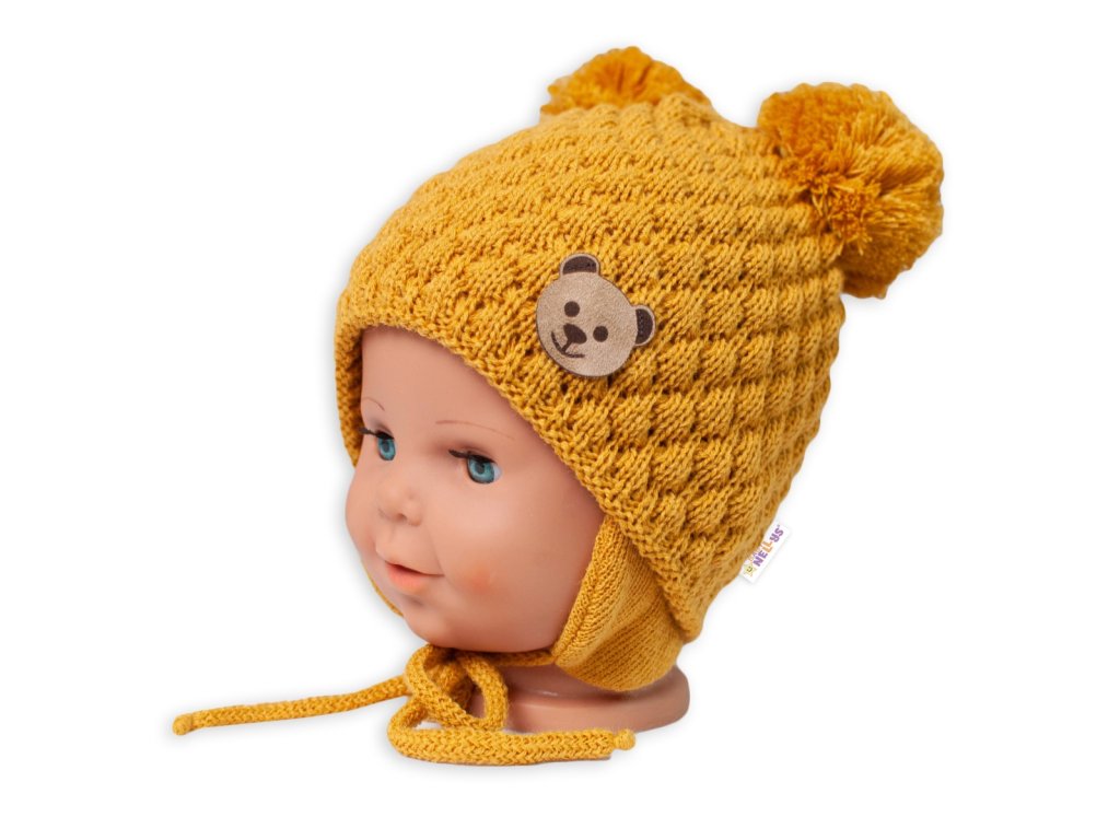 BABY NELLYS Zimní pletená čepice Teddy Bear na zavazování, hořčicová