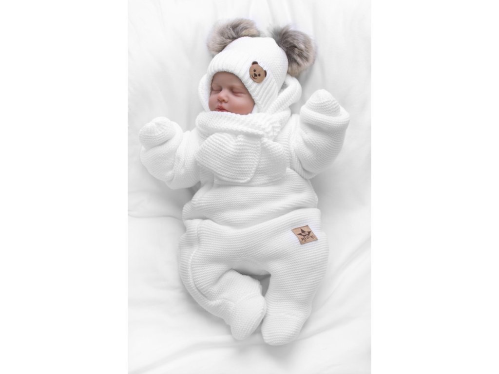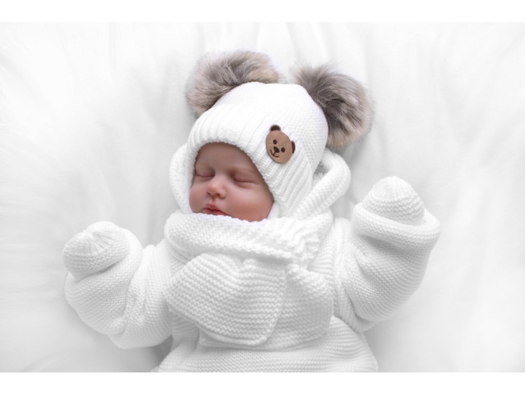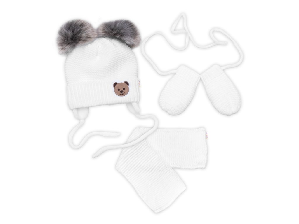 Dětská sada, zimní čepice s šálou + rukavičky 3D, Teddy Bear - bílá