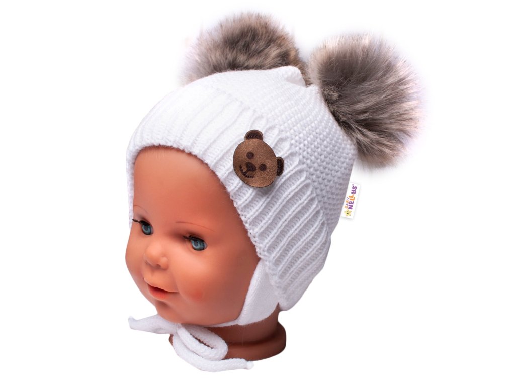 Dětská zimní čepice s fleecem Teddy Bear - chlupáčk. bambulky - bílá, šedá