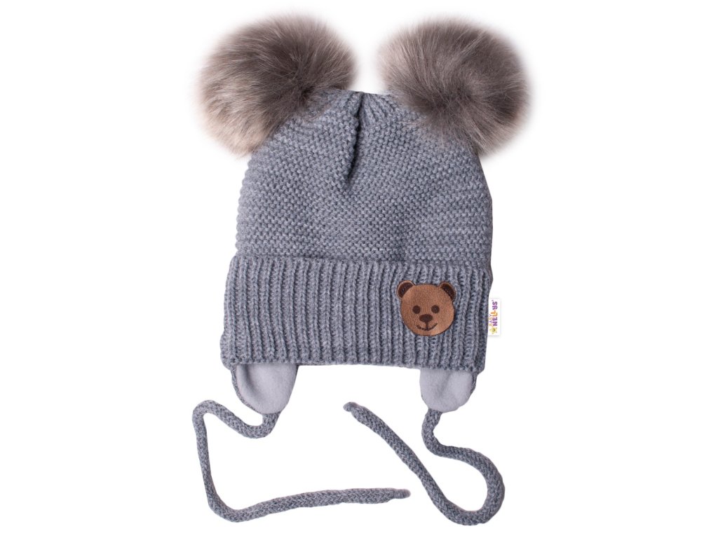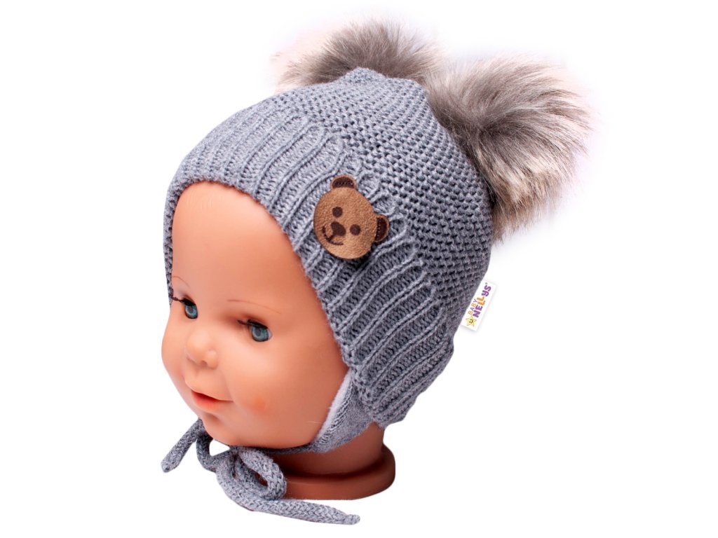 Dětská zimní čepice s fleecem Teddy Bear - chlupáčk. bambulky - tm. šedá, šedá