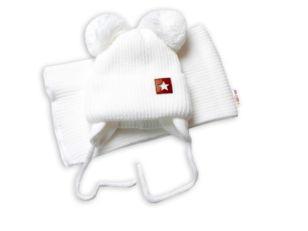 Dětská zimní čepice s šálou STAR - bílá s bambulkami, BABY NELLYS