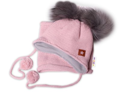 Zimní čepice s fleecem a chlupáčkové bambulky Star + komínek - pudrová, BABY NELLYS