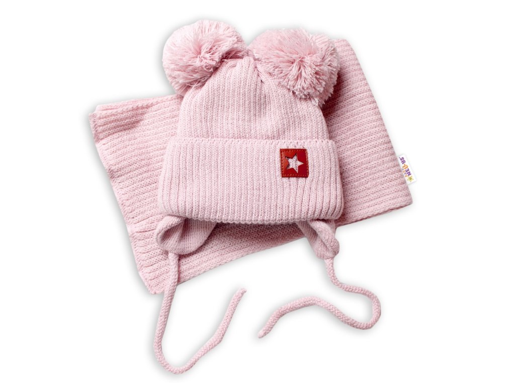 Dětská zimní čepice s šálou STAR - pudrová s bambulkami, BABY NELLYS