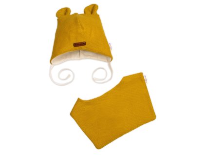 Pletená čepice s bavlněnou podšívkou a šátkem 2v1, Teddy Hand made - hořčicová