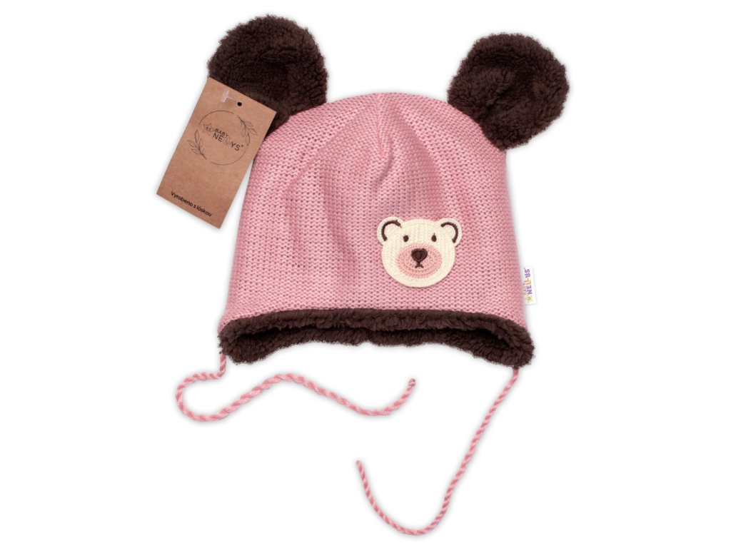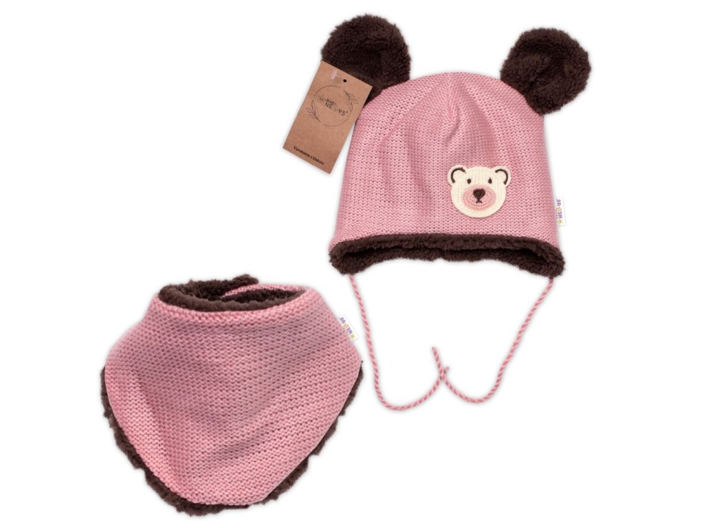Pletená zimní čepice s kožíškem a šátkem Teddy Bear, Baby Nellys, růžová