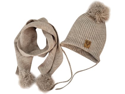 Dvouvrstvá pletená čepička na zavazování + šál s bambulky, béžový melírek