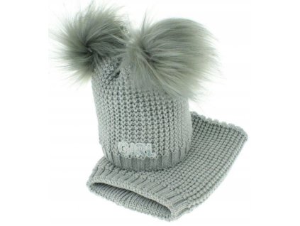 BABY NELLYS Zimní čepička s šálou - chlupáčkové bambulky - šedá, šedé bambulky