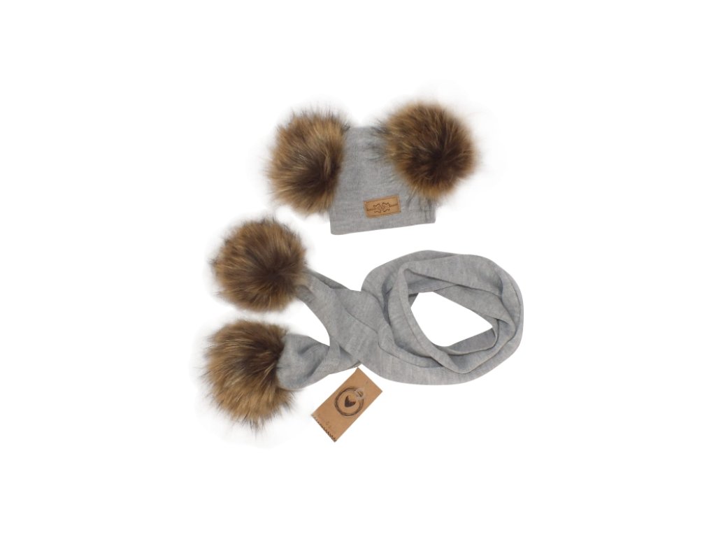 Z&Z Zimní čepice s bambulemi z kožešinky a šálou 2V1, šedá