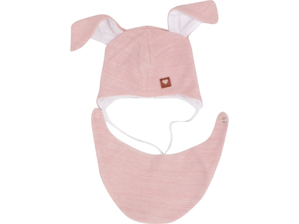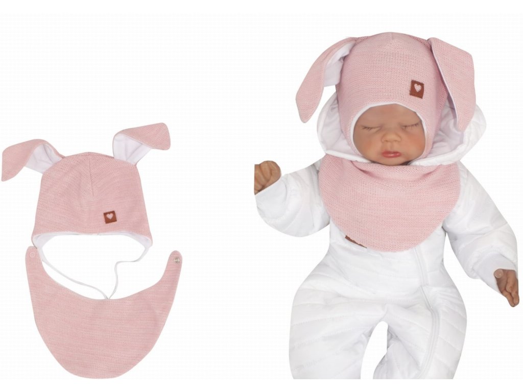 Z&Z Dvouvrstvá pletená čepice na zavazování s šátkem 2v1, Zajíček - růžová, vel. 68