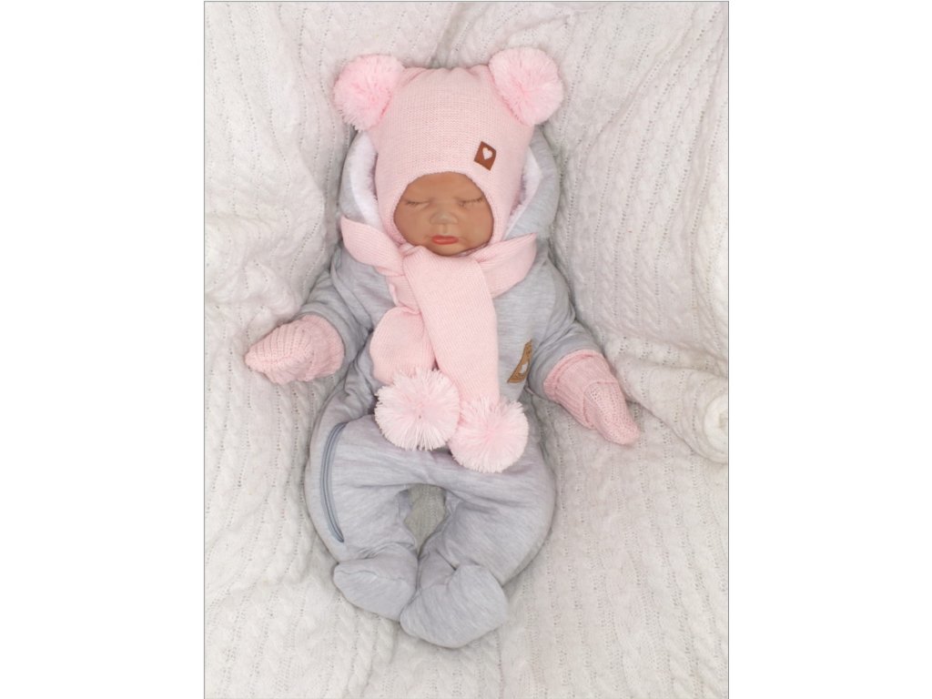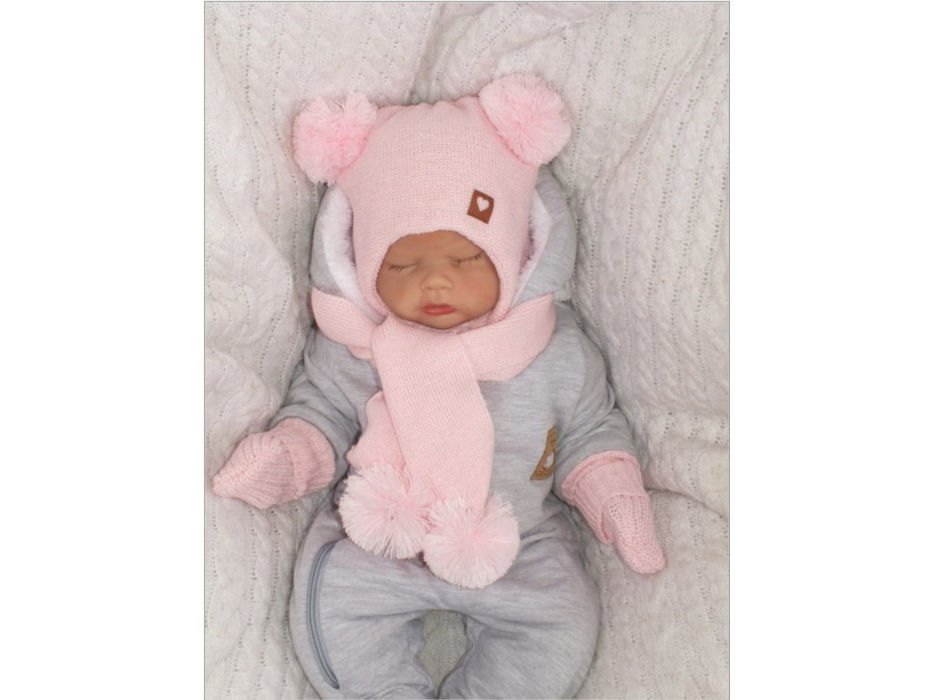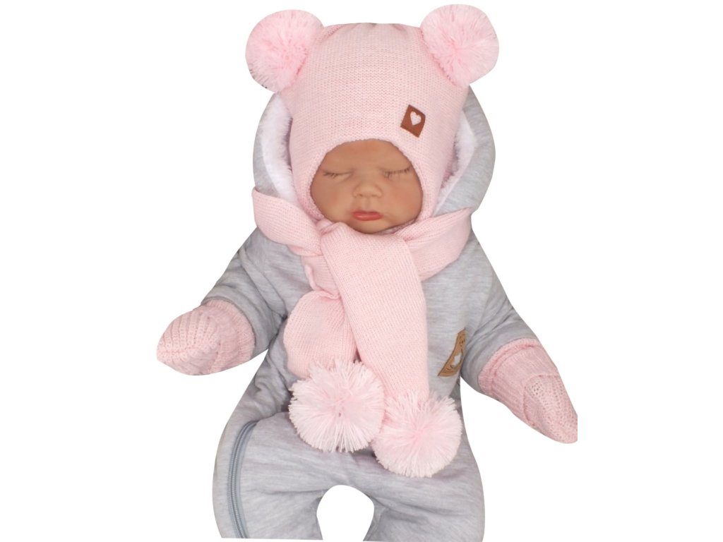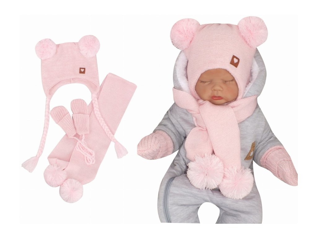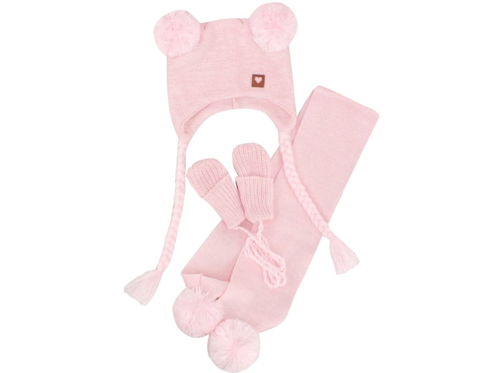 Z&Z Pletená čepice s bambulemi, šálou a rukavičky 3v1, růžová