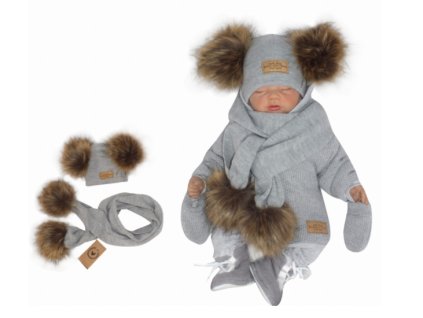Z&Z Zimní čepice s bambulemi z kožešinky a šálou 2V1, šedá