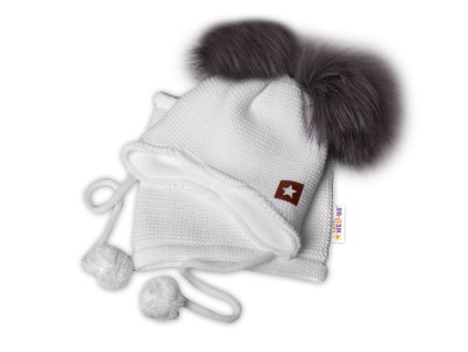 BABY NELLYS Zimní čepice s fleecem a chlupáčkové bambulky Star + komínek - bílá
