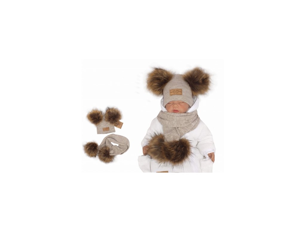 Z&Z Zimní čepice s bambulemi z kožešinky a šálou 2v1, béžová