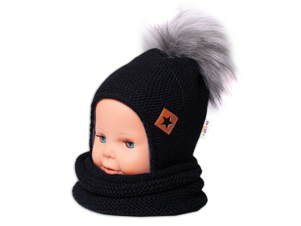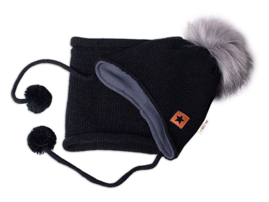Zimní čepice s fleecem a chlupáčková bambule Star + komínek - černá, 104/116, BABY NELLYS
