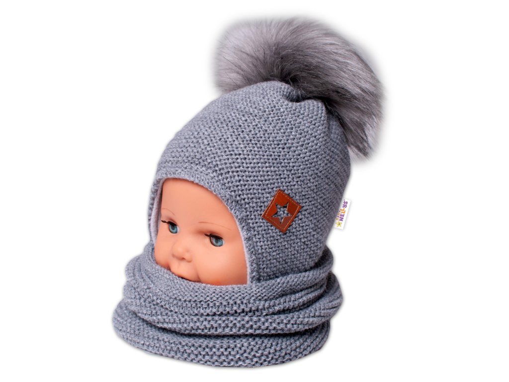 Zimní čepice s fleecem a chlupáčková bambule Star + komínek - šedá, BABY NELLYS