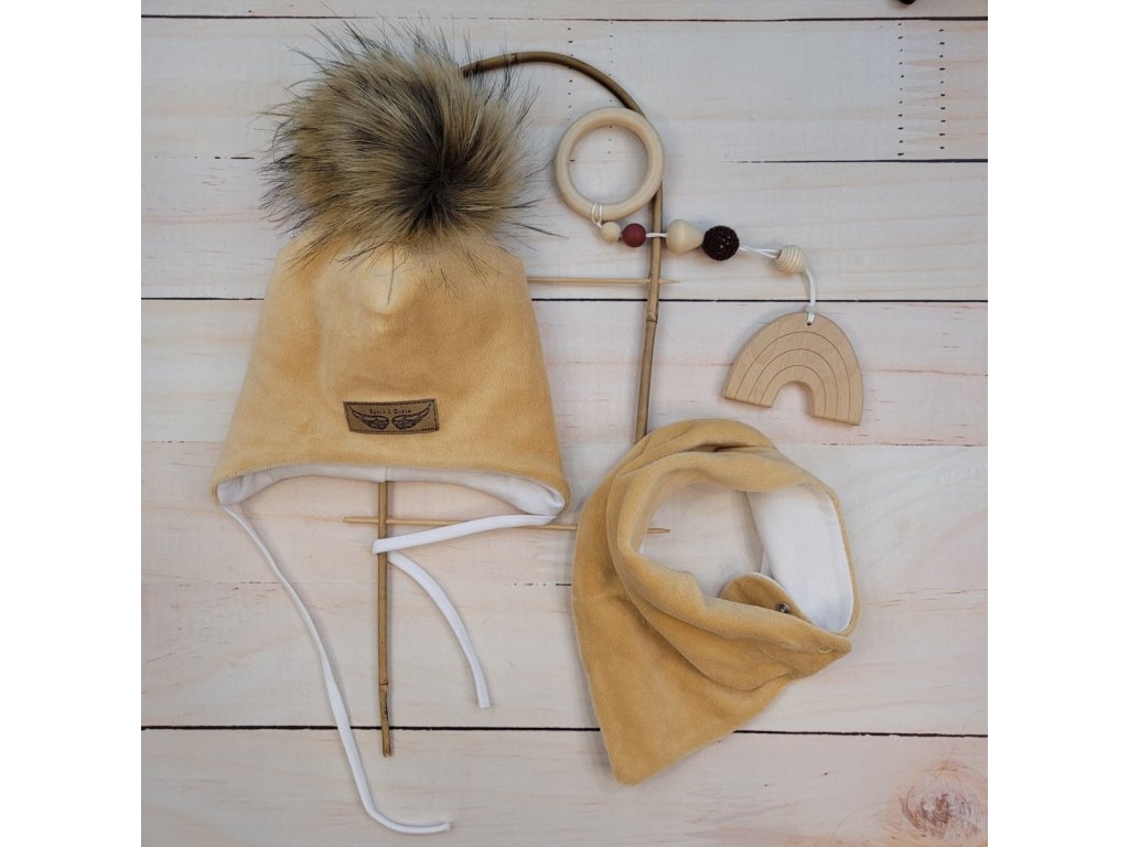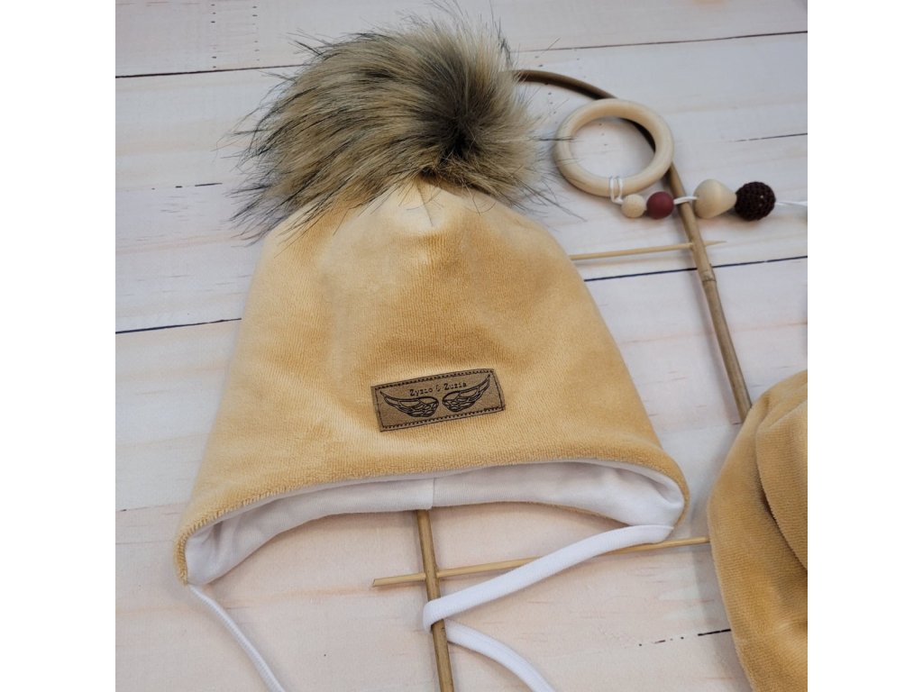 Zimní dvouvrstvá čepice na zavazování s bambulí z kožešinky + šátek Z&Z, béžová