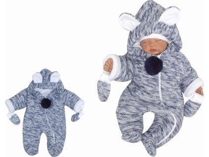 Z&Z Oteplená pletená kombinéza s kapucí a oušky + rukavičky - granátová