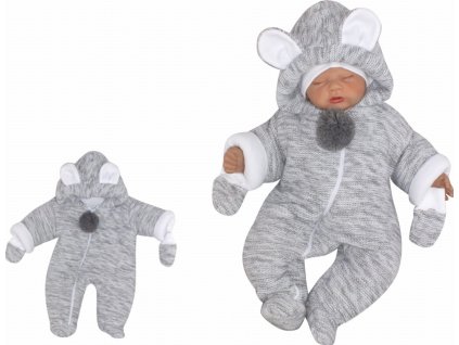 Z&Z Oteplená pletená kombinéza s kapucí a oušky + rukavičky - šedá