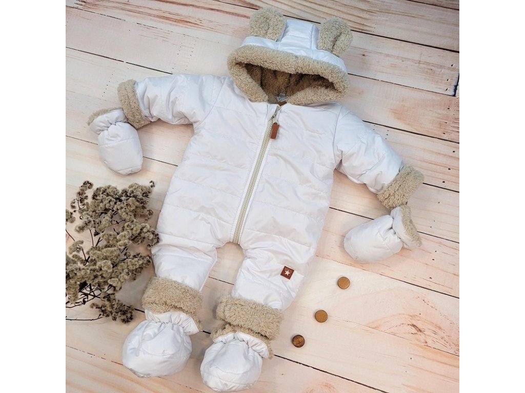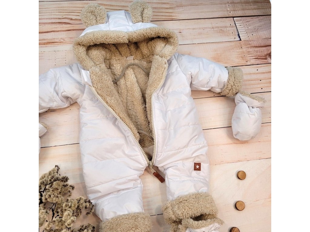 Zimní kombinéza s ozdobným béžovým medvídkem.